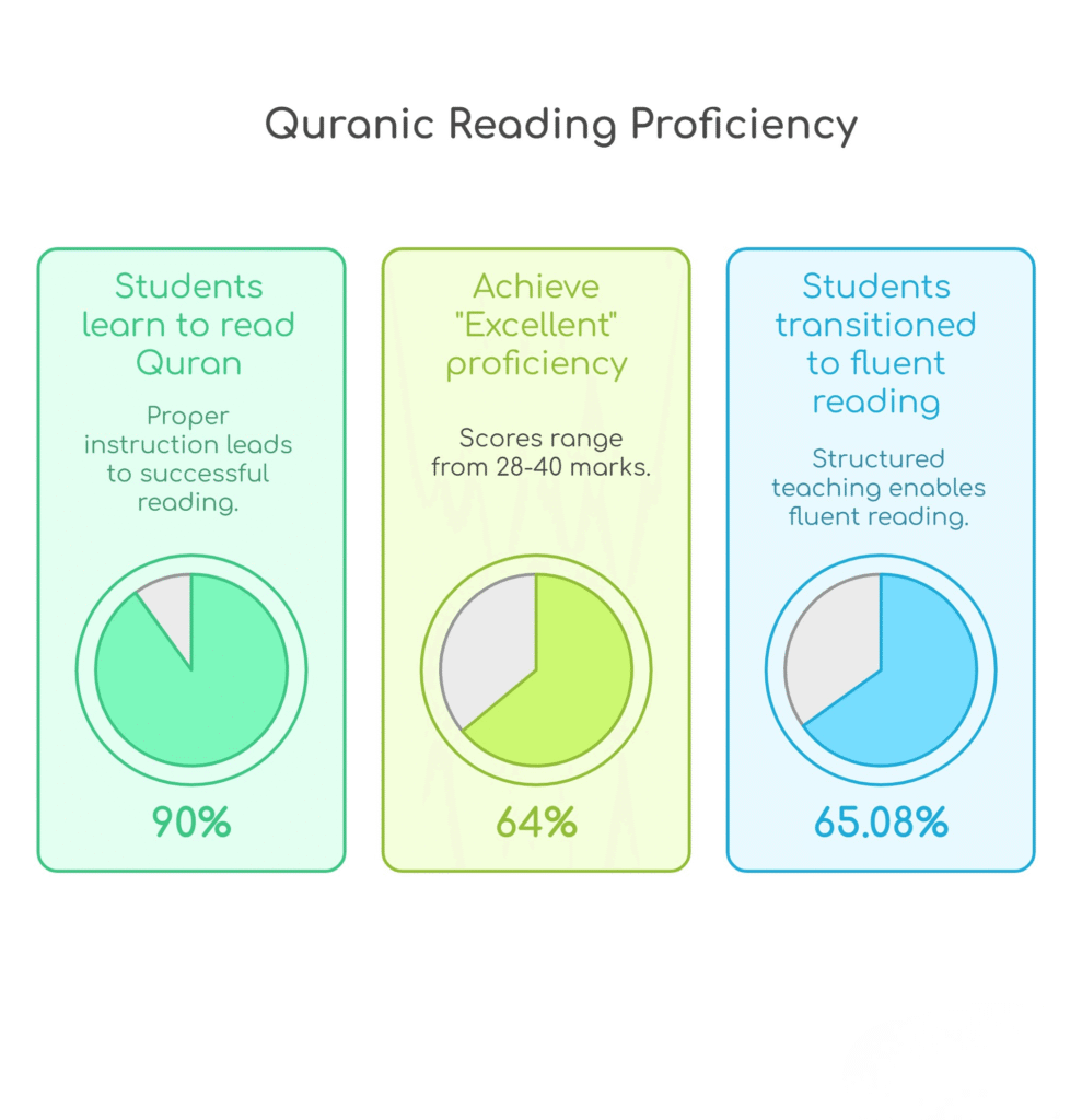 Research measuring Quranic reading proficiency reveals encouraging statistics: 90% of students successfully learn to read Quranic verses with proper instruction. 64% achieve “Excellent” proficiency with scores ranging from 28-40 marks. A separate study found 65.08% of students successfully transitioned from non-fluent to fluent reading through structured teaching.