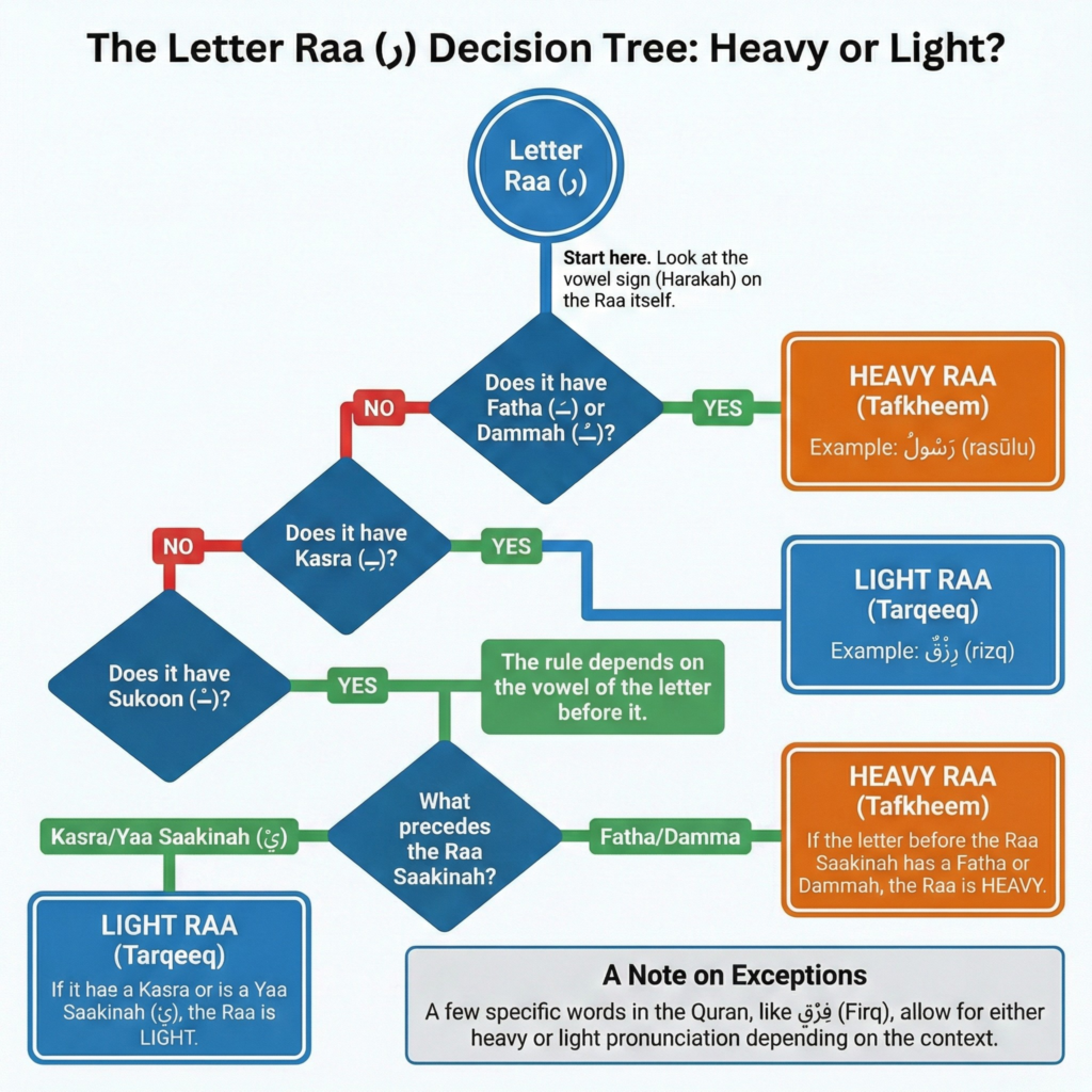 Optional cases: In words like “Firq” (فِرْقٍ) and “Misr” (مِصْر), both pronunciations are valid. Most reciters prefer light Raa when continuing, heavy Raa when stopping.